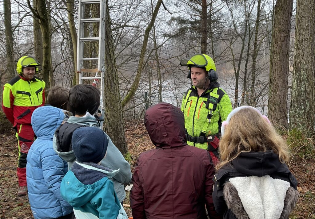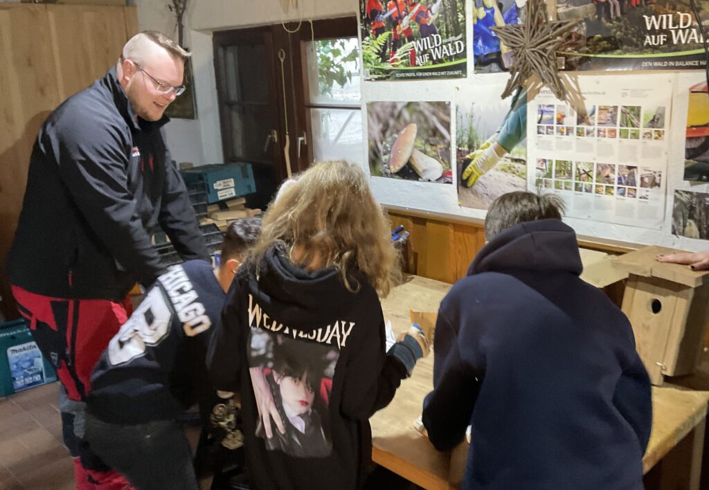 Die Kinder bauten im Team zwei Vogelhäuser, die dann anschließend jede Klasse für ihren Außenbereich mitnehmen durfte. Die Kinder sind schon sehr gespannt, welches Vogelpaar sich dort ein Heim einrichten wird. Außerdem wurden aus kleinen Flechtkörben Futterglocken für die Standvögel hergestellt, damit diese im Winter bei der Futtersuche unterstützt werden. Ein besonderer Höhepunkt war das Beobachten von Baumfällarbeiten aus sicherer Entfernung. Fachkundig begleitet erhielten die Schülerinnen und Schüler spannende Einblicke in die nachhaltige Waldarbeit und den verantwortungsvollen Umgang mit der Natur.